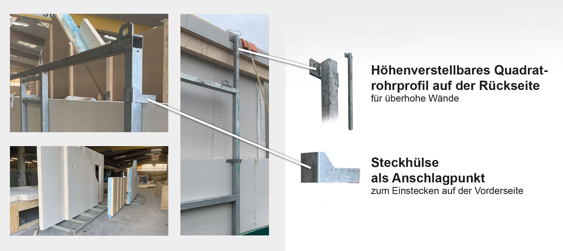 Entladung auf der Baustelle und sogar Beladung in der Halle in nicht gesicherter Höhe, Lifeline und Hubsteigerausführungen sind Zeit und kostenintensiv.